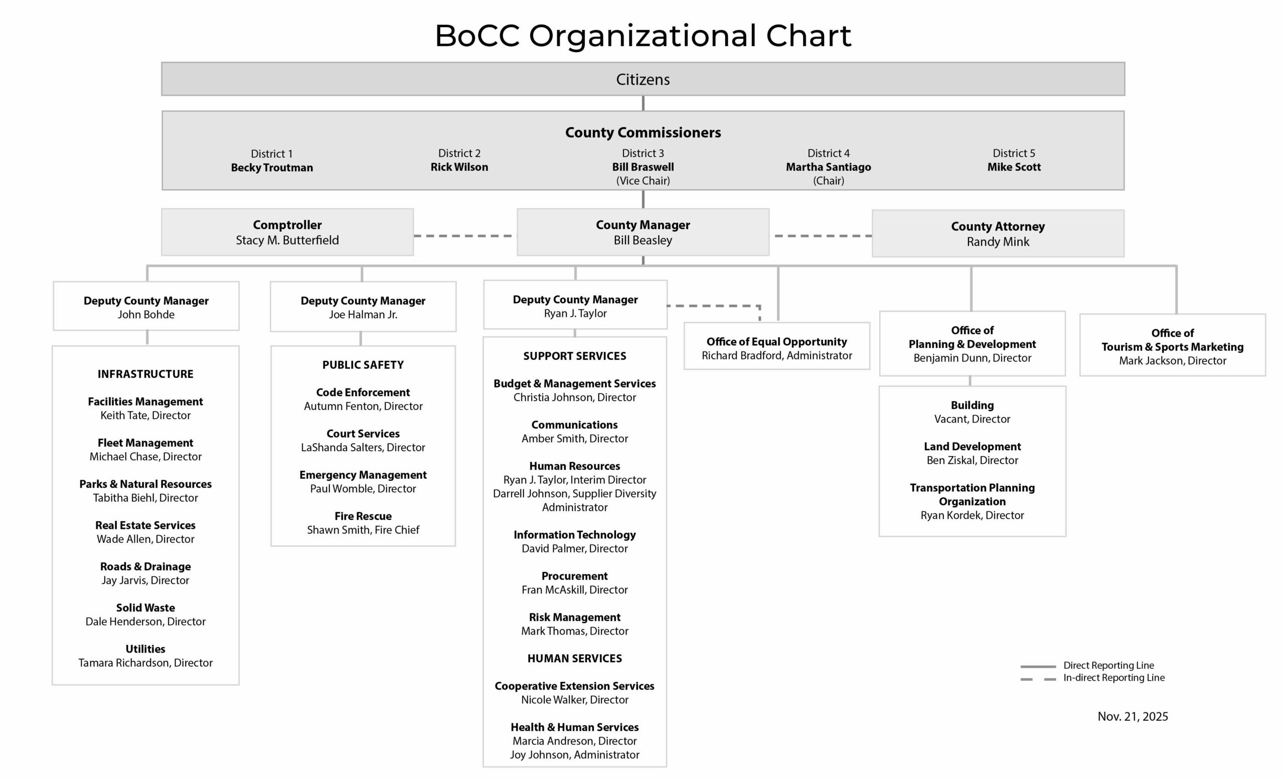 The Polk County Board of County Commissioners organization serves the residents of Polk County and is divided into 26 divisions with a County Manager, a County Attorney as well as three Deputy County Managers. Below are the Polk county phone numbers to contact each division directly. To inquire about any of the services that the county provides (permitting, starting water services, indigent healthcare), please call (863) 534-6000. To view the county organizational chart, click below.